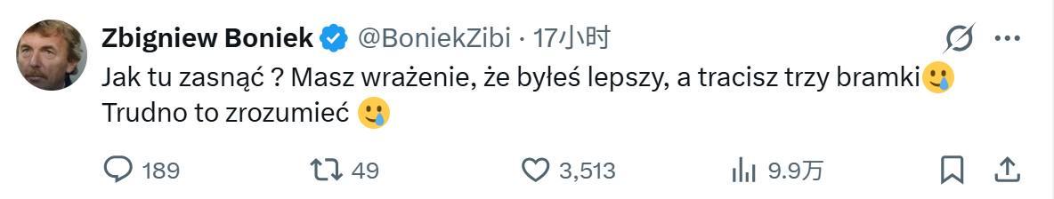 随后也许是实在气不过,博涅克又发了一条社媒表示:“怎么可能睡得着?你明明感觉自己踢得更好,却丢了三个球无缘世界杯,真是让人难以理解。”